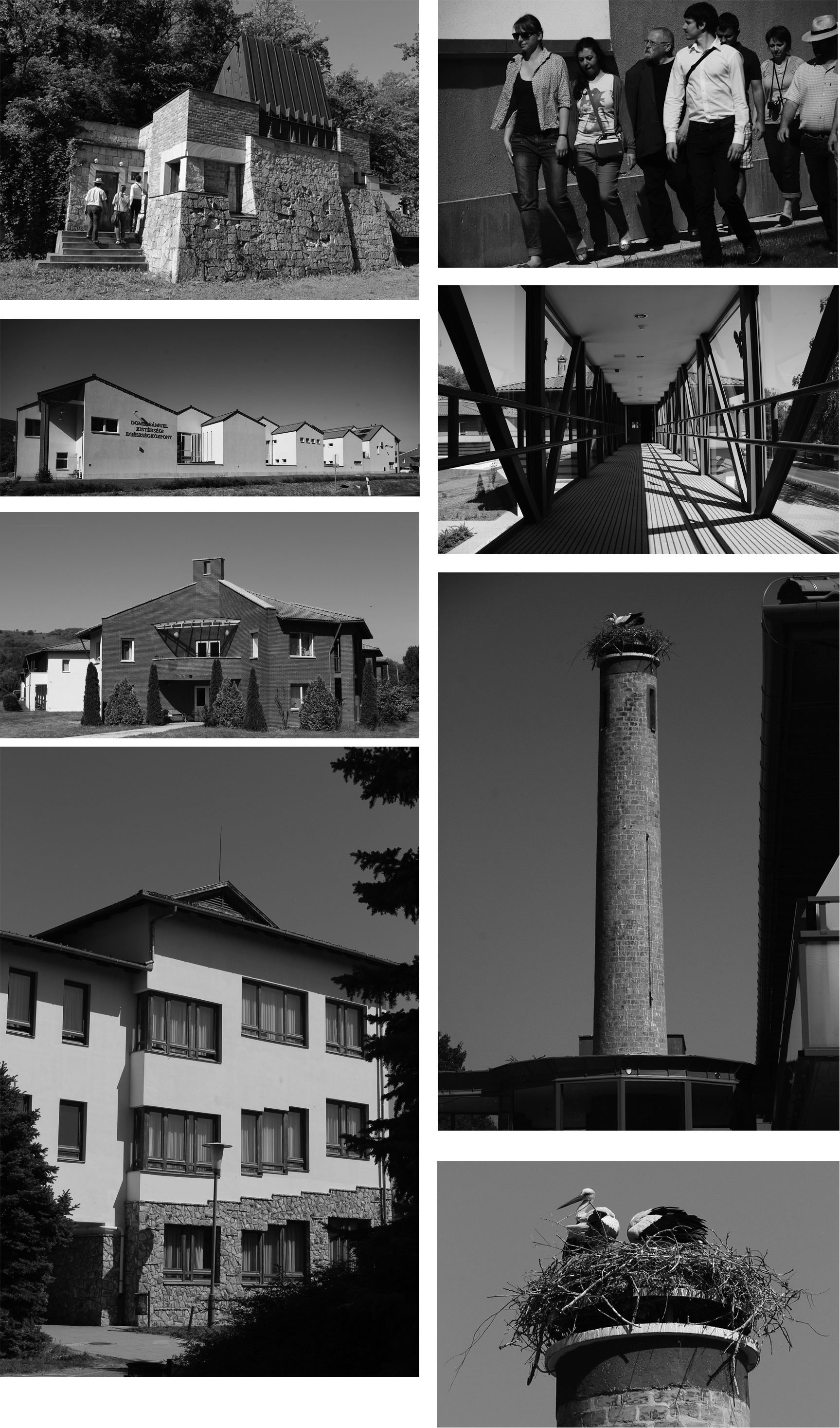 Bodonyi mesterrel továb folytatva utunkat a nemrég átadott tanszálló épülete felé vettük utunk, ami egy romos épületegyüttes átalakításaként jöhetett létre pályázat útján, a meglévő épületek szerkezetei alkotják a szálló földszinti tömegét amire ráépítéssel jött létre konzolosan teraszokkal túlnyújtva a végső 3 főtömeg, amiket könnyed acél üveg hidak kapcsolnak össze egy együttessé. A komplexum területén volt egy ipari méretű téglakémény, amin korábban is gólyák fészkeltek, ezt a fészket az építkezés alatt daruval vették le, majd helyezték azt vissza a rekonstrukció befelyeztével, ahova a gólyák is hamar visszatértek, innen a szálló neve, melyet volt szerencsénk az épület árnyékában eltöltött kávé alatt hallani, a Kelep szálló belső udvara igazán hangulatos hely lett. Kedves Csaba igazgató szívélyesen vezet körbe minket a szemközti iskolában is.