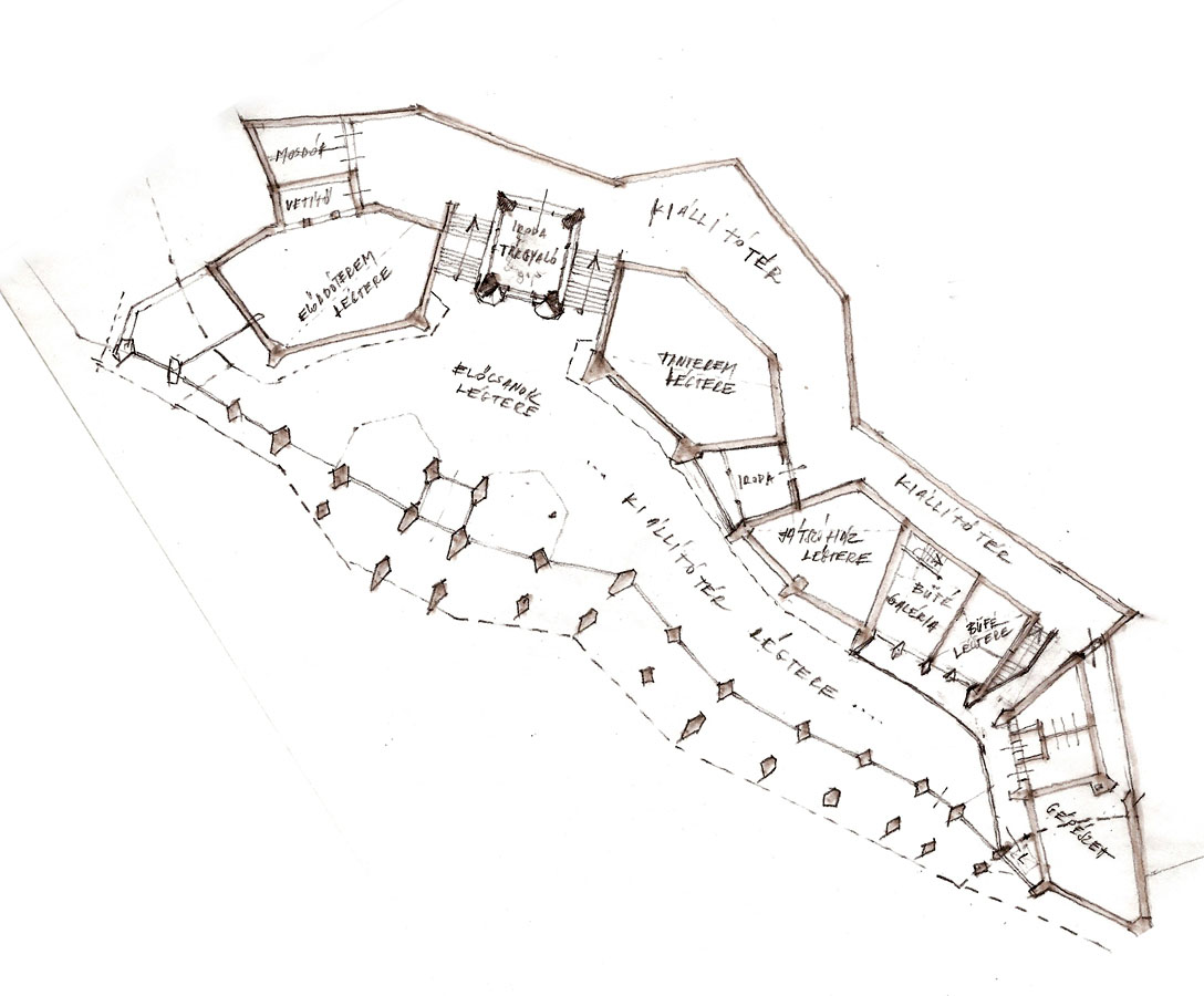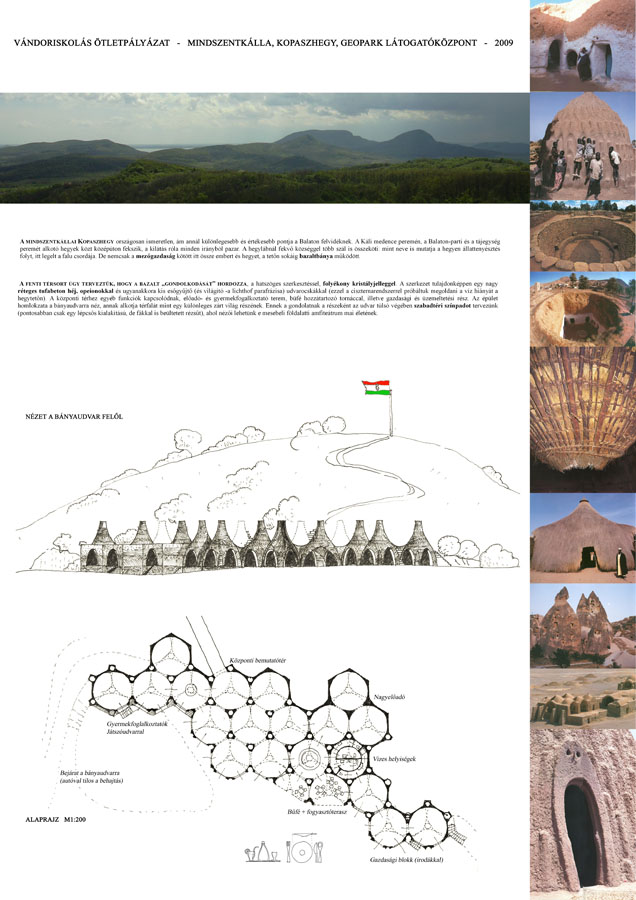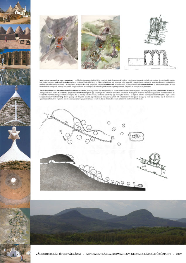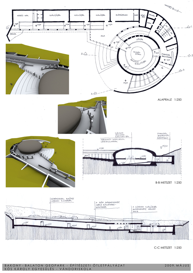 BÍRÁLAT: Az épület megközelítésére több javaslatot ad, a parkolókat lent a faluban helyezi el, ezzel felszabadítja a látvány feltárulását már a romtemplomnál. A romtemplomot teljesen rekonstruálná, a körítő falakkal együtt. A feljutási alternatívák közül néhány munkahelyet is teremthet a faluban, ami előny (pl. lovas kocsik). Lent a hegy lábánál elhelyez egy fogadóépületet, mely megjelenésében és funkciójában is még kötődik a faluhoz (felvonójegyek, belépők, kis üzlet stb.), de anyaghasználata már a hegytetőt előlegezi meg. A fenti bányaudvarban elhelyezett épület kialakítása a külszíni fejtések felületét idézi meg. Az emberkéz tájban okozta sebek nyomát pozitív képpé igyekszik formálni, itt az a teremtő erőt jeleníti meg. A főépületbe a tárnán keresztül érkezik, izgalmas lüktető térsoron át, az újonnan vájt alagút azonban itt is felvet problémákat. Alapvető koncepciója jó, de kidolgozottsága nem meggyőző, formájában erőtlen épületet hoz létre, az épület formáját funkcionálisan sem mindenhol támasztja kellően alá. A zsűri megvételben részesíti.