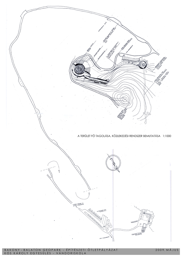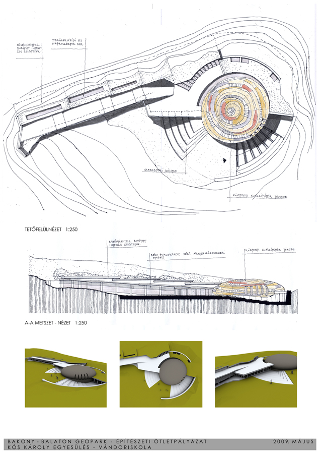 BÍRÁLAT: A mű alkotói sajnos nem tudtak személyesen megjelenni, ezért a zsűri közösen igyekezett értelmezni a tervet. A terv kidolgozottsága szembetűnő és dicséretes. Foglalkozik a templomrommal, de megoldási javaslata nem szerencsés. A burkolt, városi jellegű tér kialakítása a helyhez nehezen köthető, nem támogatandó. A látogatóközpont megközelítésére a meglévő felvezető út komolyabb kiépítését javasolja, megfelelő sűrűségben kitérőkkel, fent a bányaudvarban parkolókkal. Ez a megközelítés a zsűri egybehangzó véleménye szerint a legszerencsétlenebb. A bányaudvarban viszont az épület nagyot ?durrant". Nagyvonalú formájával magára vonzza a látogató érdeklődését, emblematikus épülete lehetne a geoparknak. Bár formája tájidegen, a bányaudvarban elrejtve, hirtelen feltárulásával telitalálat. A látványban elsőrendű fő tömeg burkolatának kiállító-felületként történő használata külön érdekes. Oldalszárnyainak anyaghasználata kellően semleges, nem vonja el a figyelmet a fő attrakcióról. Belső világa izgalmas, de az oldalszárnyak kapcsolata a fő attrakcióval kérdéses. A tervet kidolgozottsága és emblematikus megjelenése miatt a zsűri megosztott első díjban részesíti.