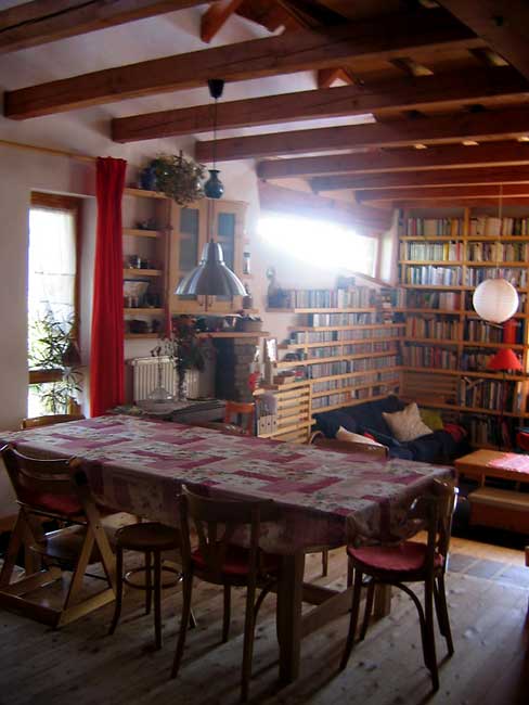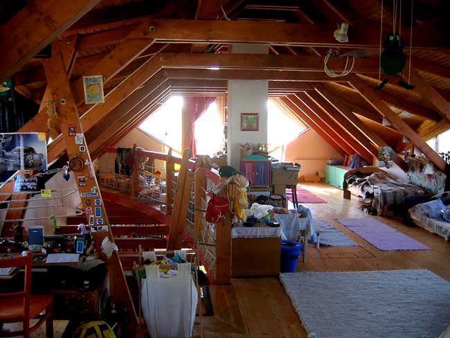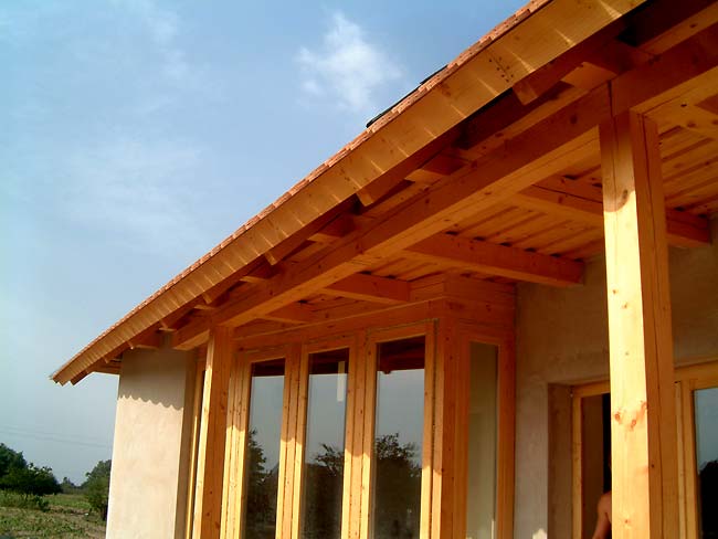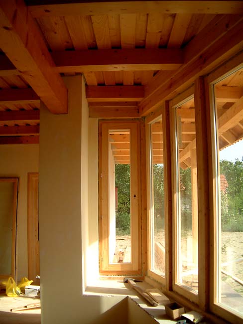 A ház persze csak a padlótól a padlásig "bio": a vasbeton sávalapok felett bitumenes lemez szigetelés, és klinkertégla lábazati burkolat jelzi a modern kor követelményeihez való alkalmazkodni akarást. A falegyent összefogó vasbeton koszorú felett azonban pallóterítéses fafödém és fa tetőszerkezet található. Mint a tervező meséli, mindenki annyira bio-szellemiségű, amennyire a pénztárcája engedi; szerencsére itt sikerült elérni, hogy például a hajópadló homokterítésre kerüljön, vagy a költségek növekedésének ne a fa nyílászárók műanyagra cserélésével vessenek gátat.