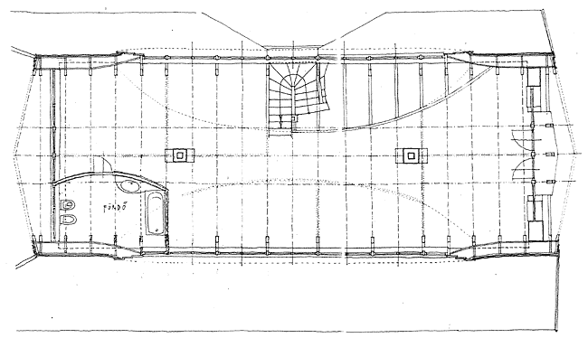 A ház a telek adottságai miatt lett az eredeti L-alak helyett téglalap alaprajzú, ehhez viszont már értelemszerűen "csapódott" a tornác is. A háromosztatúság kapcsán kerestem fel a végzett vándort, aki az alaprajzon megjelenített felosztás szerint magyarázta azt, de az volt az érzésem, hogy a terv hamarabb meg volt, mint a gondolat, hogy az épület két háromosztatú ház egymásnak hátátfordítása. Ugyan a családi élet többnyire valóban a konyha-étkezőben zajlik és a nappalit (mint a tisztaszobát) szinte csak vendégek fogadásakor használják. Az építész családfő fontosnak tartotta az egy légterűséget, ami főképp az emeleten, a gyerekek szintjén érhető tetten, de a födém átszakításával szinte az egész épületet teszi azzá.