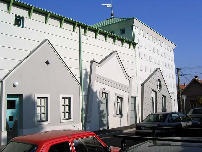 A homlokzatokról leolvasható szimbolika egyértelmu, némiképp már harsány. Egy végigvonuló kereszt- irányú nyeregtetos tömegbol, a ritmus szerint, elobújik egy alföldi parasztház-bütü, összekombinálva egy léptékében megnövelt kukoricagóréval.