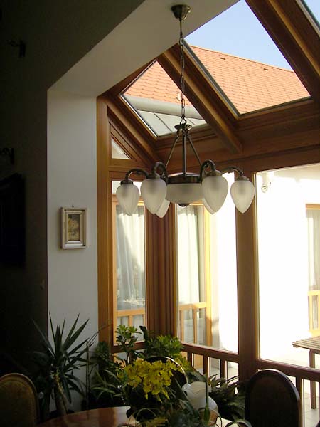 Zavarba ejto továbbá a tetotér utcai szobájának elhelyezkedése, mely óvatosan elcsúszik a földszinti nappali fölött -minek következtében egyik határoló fala az alsó helyiség tere fölé kerül, s belopja magát az áll-kukoricagóréba is, mely így zárt erkélyként funkcionál. A homlokzatról elsore leolvasható kép tehát csalóka. Egyfelol a lineárisan szervezett alapegységek mindegyike rejt egy kis centrális szentélyt, másrészrol a határozottan elválló két forma mögött, a tetotérben, valójában egy helyiség bújik meg -vállalván így, a belso térben kialakuló formai, és szerkezeti bonyodalmakat. Akár egy kis buvész-doboz.