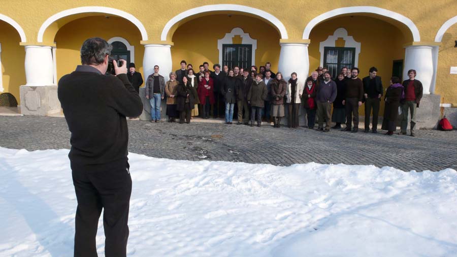 A vándoriskola témáját régebbi vándorok közös vándorokkal karöltve adták elő, felosztva maguk között a különböző témákat. Mi, Vándorok javaslatot tettünk új, a mesterek és a Vándorok közös és aktuális elképzelései szerint módosított alapszabály létrehozására, amely rögzítené a vándorok képzési feladatait, biztosítaná a képzésben való részvételt, rögzítené az adható bérezés minimumát, a közös rendezvények költségeinek térítését, esetleg szolidaritási alap létrehozását, a külső pályázatokra történő jelentkezés módját, lehetőségeit. A jelenlévők felhívták a figyelmünket, hogy minden esetre egy szabályzat sem készíthet fel. A problémákat konkrétan kell megoldani, a megoldást a mesternek és a vándornak, esetleg a vándoriskola vezetőjének közösen kell megtalálnia. Ennek ellenére valószínű, hogy az alapszabályzat is módosításra szorulhat, pontosabb előterjesztés megfogalmazására kidolgozására az Igazgató Tanács előtt 2 héttel történő közreadására kértek minket, Vándorokat és Csernyus Lőrincet. Kováts Ábel és Török Ádám, öreg Vándorok, ismertették a 6 féléves program tematikáját és a jelenlegi félév menetét, témáit, meghívott előadóit, a mestereket fokozottabb jelenlétre kérve a képzésben. A nap további részében, a pogácsázáson és kávézáson túl, még fényképezkedni is jutott időnk. A zord hideget enyhítette, hogy a nap második felében kisütött a nap, tele élményekkel, gondolatoktól elmerengve tértünk haza. A konferencián elhangzó témák, érzések, és agyi idegpályákat megmozgató gondolatok, problémák még sokáig jártak talán mindenki fejében, azonban estére talán már mindenki visszatért a valós pillanatba, lelkiekben felkészülve a legközelebbi kihívást és feladatot jelentő következő munkahétre.